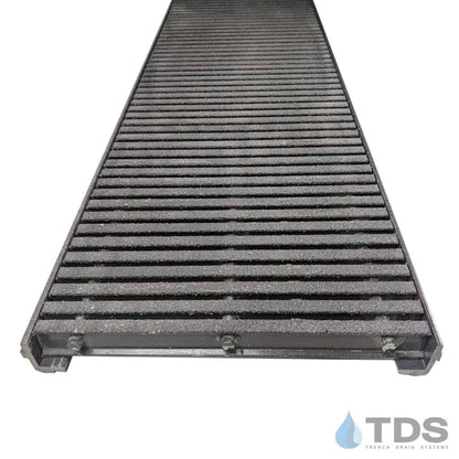 Fiberglass FRP kit with 15" wide I-Bar grate(s) and the WYE frame creates an excellent system for applications where longer support spans are required, such as roadways and parking areas. This kit allows a custom concrete-poured trench to be built using the frame shape as the kit's anchoring system, locking the frame into the concrete pour. The grates are manufactured with layers of resin and fiberglass strands to create better traction than metal bar grating. This kit, when properly installed, has a Load Class C traffic rating