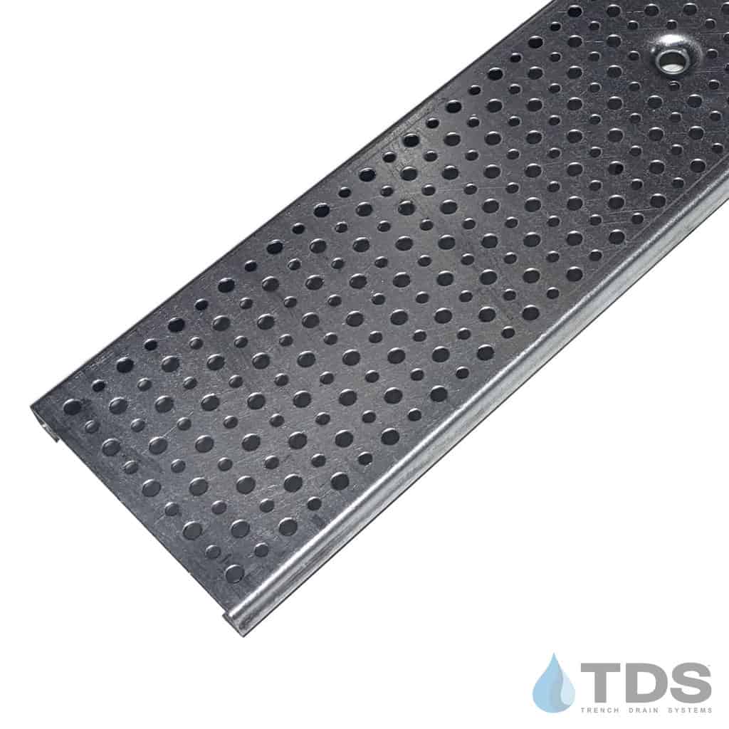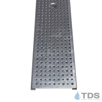 Grate measures 5.19"W x 0.75"H, with length options of 24" and 48". The Foam perforated grate, which features an attractive and exclusive TDS pattern, and is rated as load class A for light loads. These grates are perfect for any low-traffic applications such as pedestrians, bicycles and golf carts.