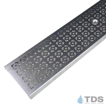 Grate measures 5.19"W x 0.75"H, with length options of 24" and 48". The Square Deco grate features an attractive and exclusive TDS pattern and is rated as load class A for light loads. These grates are perfect for any low-traffic applications such as pedestrians and bicyclists.
