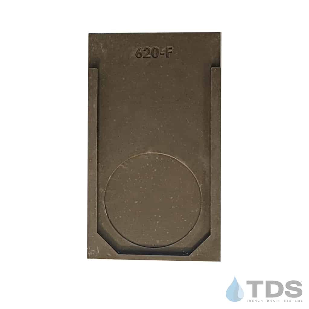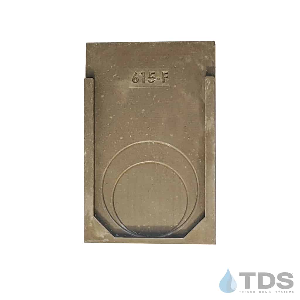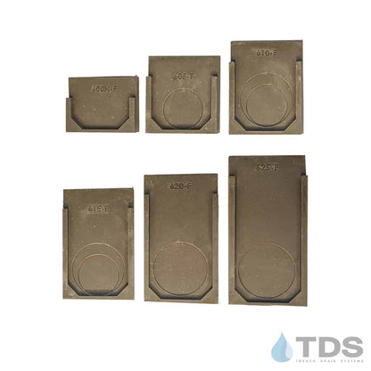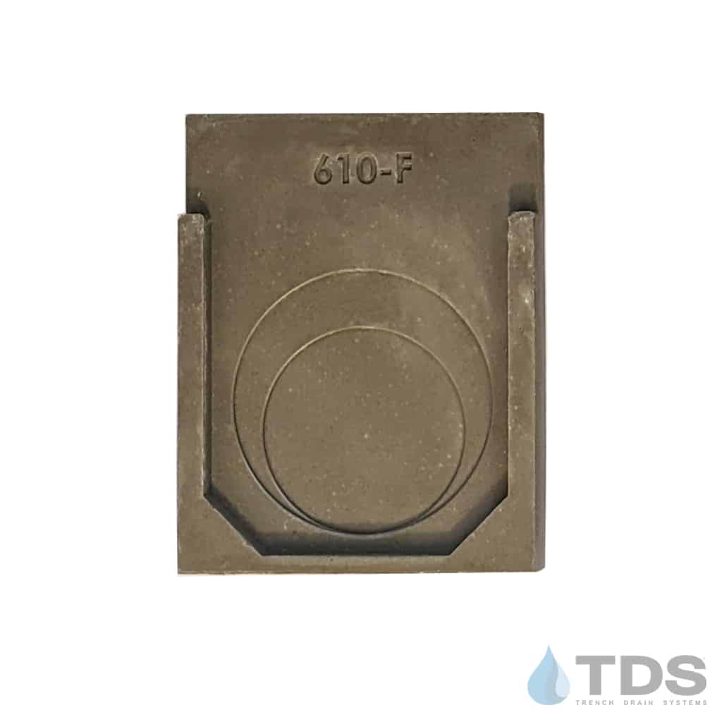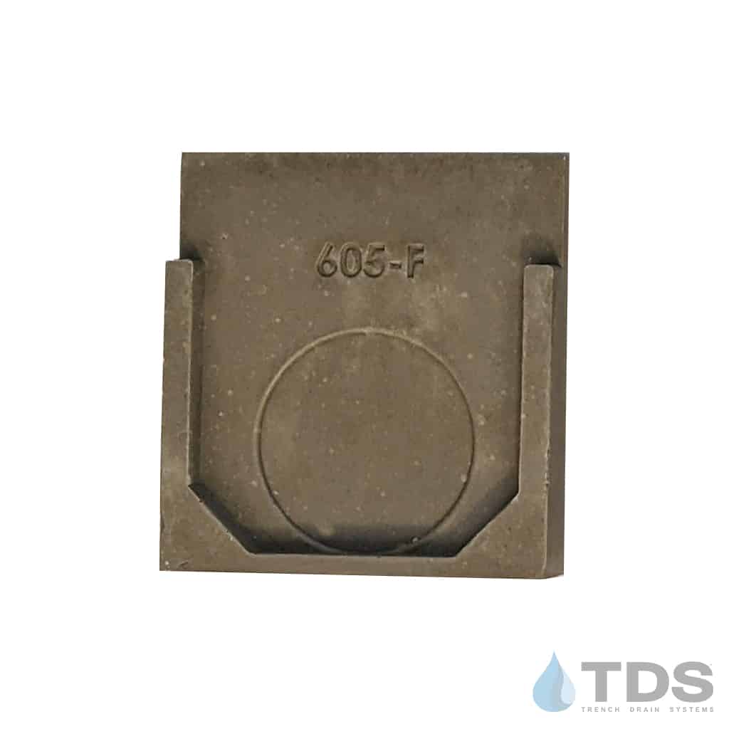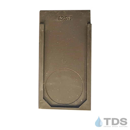 Trench Drain Systems exclusively offers solid polymer concrete closed outlets for POLYCAST® 600, POLYCAST® 700 and POLYCAST® 900. These end caps, with the exception of the 600N-625, have embossed areas for core drilling to accept pipe outlets in 3" or 4" diameters. They sit on the outlet / male end of polymer concrete channels.