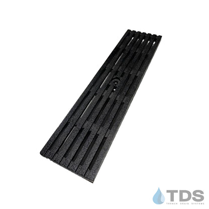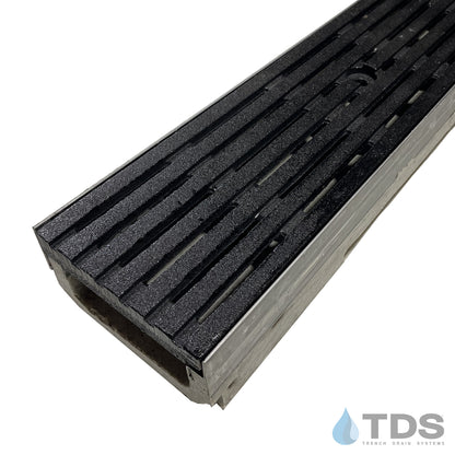 ULMA M100KX shallow polymer concrete channel w/ stainless steel edge and exclusive Bronze Age™ BARS ductile iron grating.