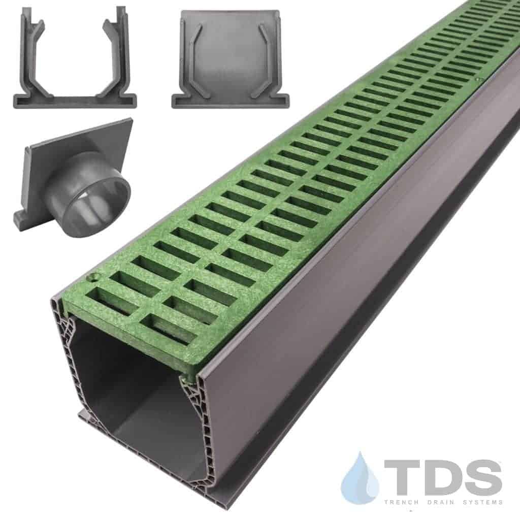 Mini Channel plastic drain is a non-sloped system built for light traffic applications such as pools, patios, and walkways. The channel is UV protected and manufactured from durable lightweight polyolefin. This kit has a polyolefin grate in the Slotted pattern by NDS in Green.