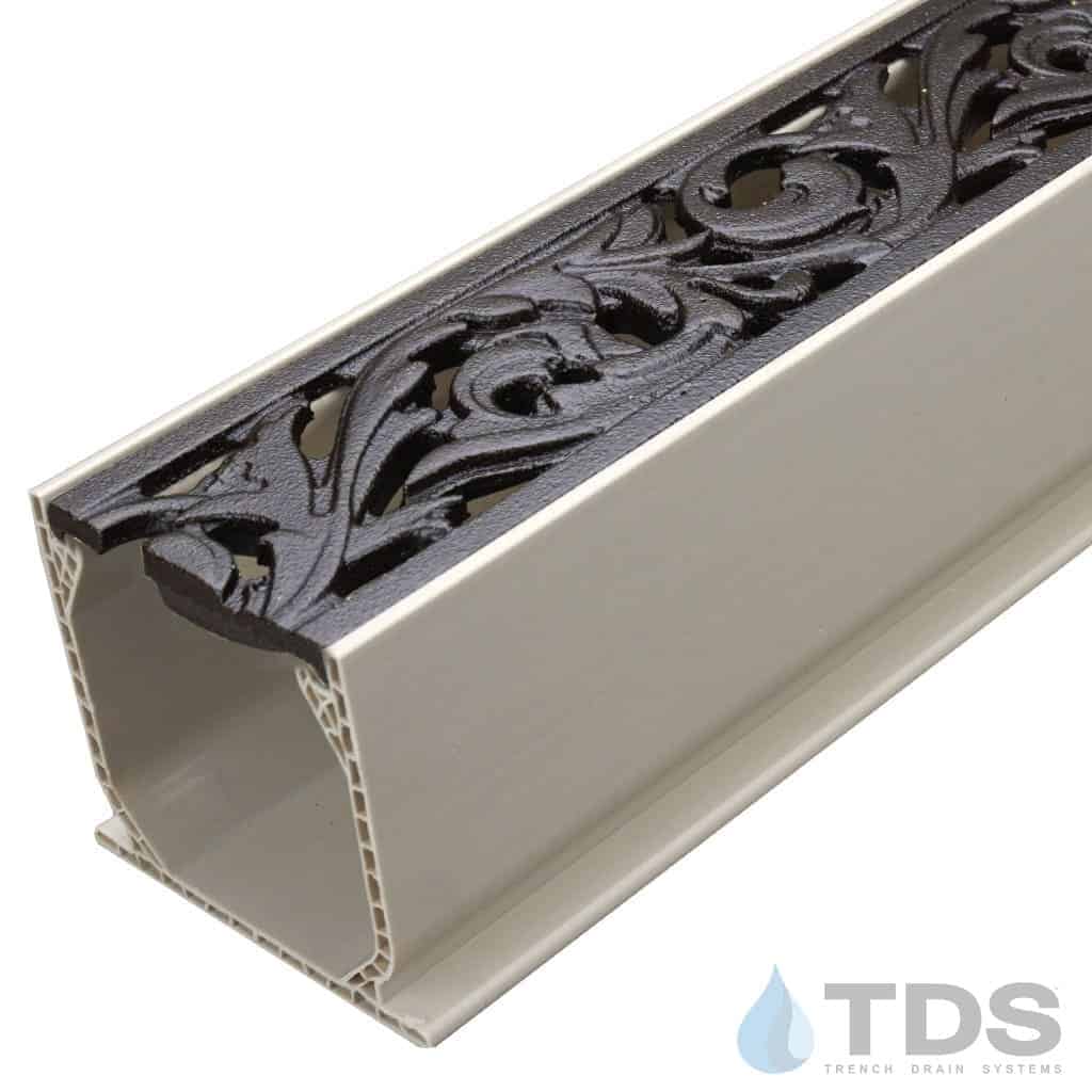 Mini Channel plastic drain is a non-sloped system built for light traffic applications such as pools, patios, and walkways. The channel is UV protected and manufactured from durable lightweight polyolefin. This kit has a cast iron grate in the Acanthus pattern by Iron Age with a TDS Baked on Oil Finish.