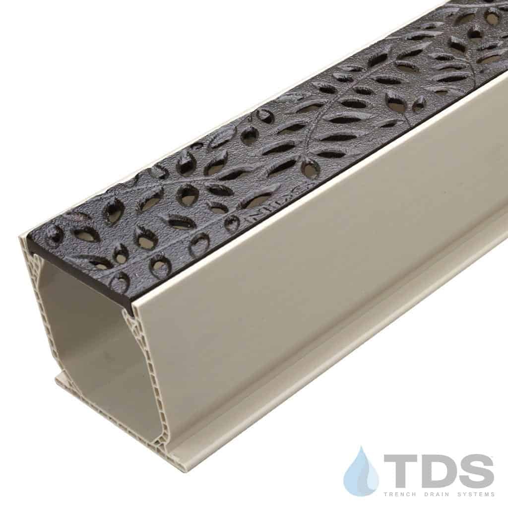 Mini Channel plastic drain is a non-sloped system built for light traffic applications such as pools, patios, and walkways. The channel is UV protected and manufactured from durable lightweight polyolefin. This kit has a cast iron grate in the Botanical pattern by NDS with a TDS Baked on Oil Finish.