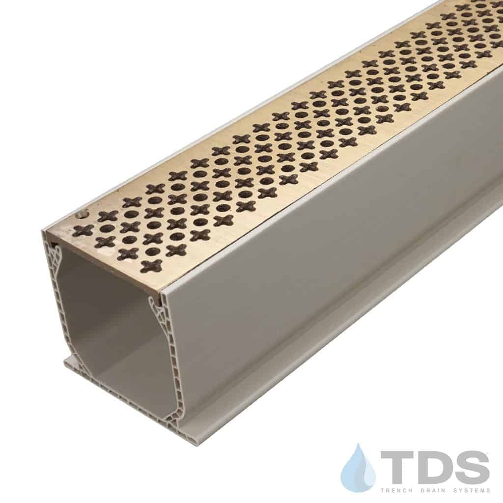 Mini Channel plastic drain is a non-sloped system built for light traffic applications such as pools, patios, and walkways. The channel is UV protected and manufactured from durable lightweight polyolefin. This kit has a bronze grate in the Cathedral pattern by TDS Bronze Age with a brushed finish. The cathedral pattern grate is ADA compliant and heelproof.