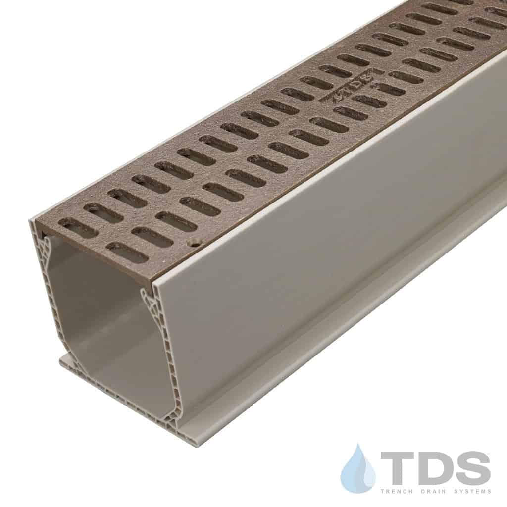 Mini Channel plastic drain is a non-sloped system built for light traffic applications such as pools, patios, and walkways. The channel is UV protected and manufactured from durable lightweight polyolefin. This kit has a bronze grate in the Slotted pattern by TDS Bronze Age with a natural finish.