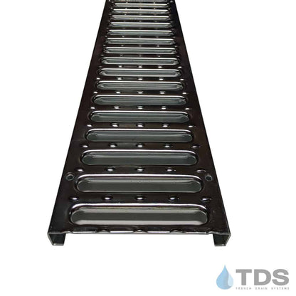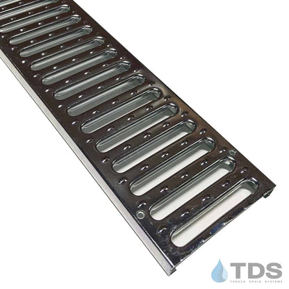 Galvanized slotted Class B grate for driveway traffic. Grate is for the NDS® Pro Series 5 trench drain system. Open surface area 19.32 square inches per foot. Class B: Loads 61-175 psi. Recommended for medium-duty pneumatic tire traffic, autos, and light trucks at speeds less than 20 mph.