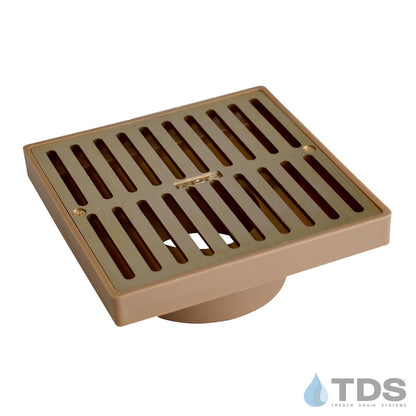 NDS® 920B is a 6" square satin brass grate with brass colored 3" styrene low-profile adapter. This versatile pipe adapter is designed to fit 3" or 4" Sewer and Drain pipe or fittings, corrugated pipe, and triple wall pipe. It has an open surface area of 11.6 square inches and can handle water drainage flow up to 35.49 GPM (Gallons Per Minute). It is ADA-compliant and is rated for pedestrian or light-weight traffic.