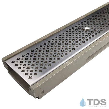 POLYCAST® 500 is a neutral shallow trench drain that is 1.75” in depth, 6.25" wide and comes in 48” lengths. A bottom outlet will need to be core drilled for pipe connection.
