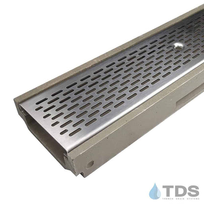 POLYCAST 500 shallow trench drain is 1.75" in depth, 6.25" wide and comes in 48" lengths. A bottom outlet will need to be core drilled for pipe connection. Installation chairs are included and provide a tight joint between channels while aligning and leveling the drainage run.