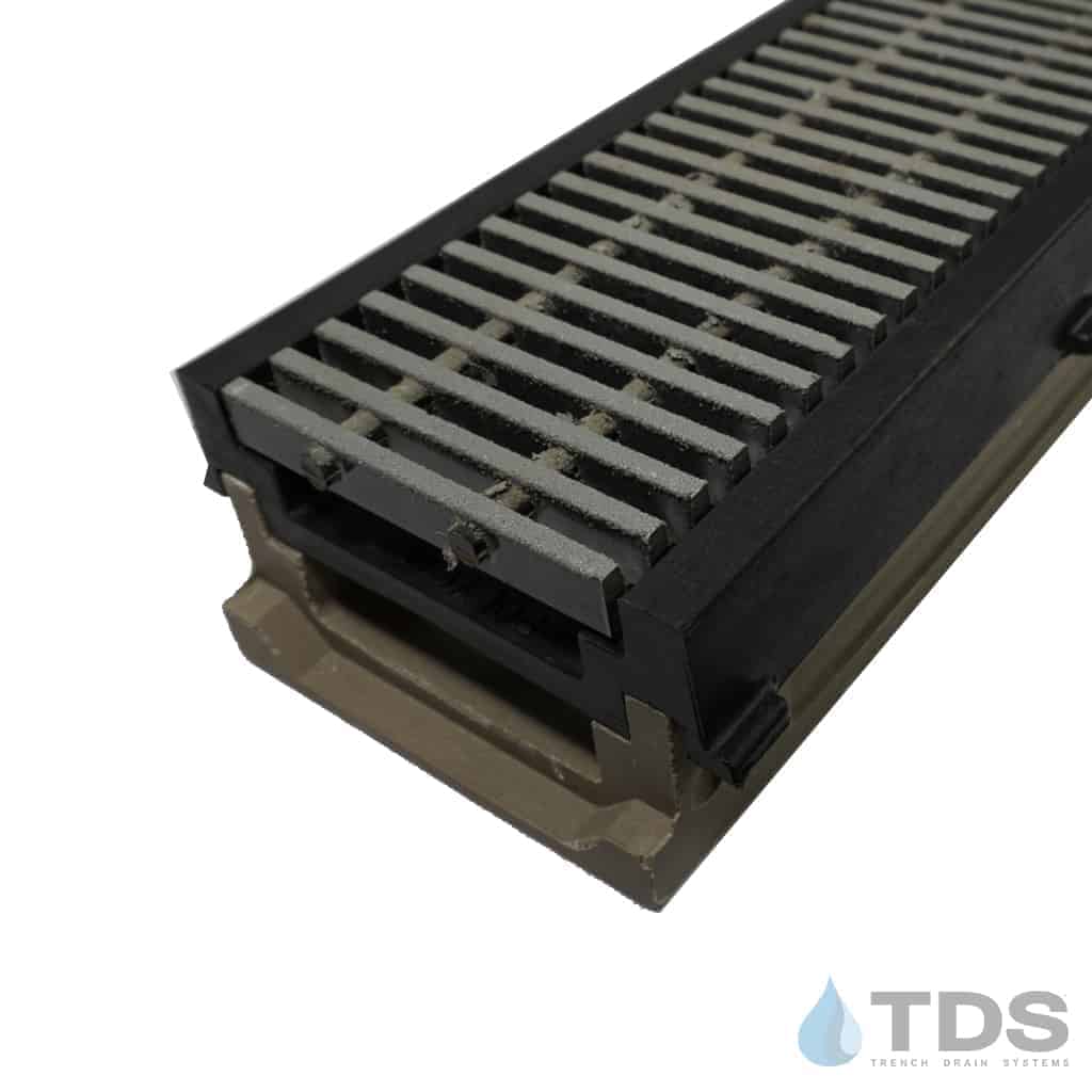 POLYCAST 500 shallow trench drain is 1.75” in depth, 6.25" wide and comes in 48” lengths . A bottom outlet will need to be core drilled for pipe connection. Installation chairs are included and provide a tight joint between channels while aligning and leveling the drainage run.