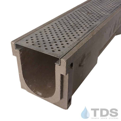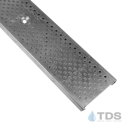 POLYCAST® 600 Series is a 6.25" wide (OD) polymer concrete channel with a built-in 0.65 percent slope, allowing the system to achieve flow rates of 470 GPM. The DG0646 is a 5.25" wide galvanized steel perforated grate that offers a decorative look to your project.