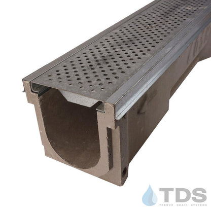 POLYCAST® 600 Series is a 6.25" wide (OD) polymer concrete channel with a built-in 0.65 percent slope, allowing the system to achieve flow rates of 470 GPM. The DG0646 is a 5.25" wide galvanized steel perforated grate that offers a decorative look to your project.