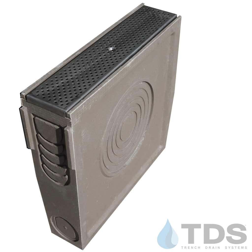 The catch basin accepts the same grate options, edging, and frames as the POLYCAST® 600 trench drains for an unnoticeable transition between the channels and catch basin. Cut-outs for side, bottom, and end outlets are located on the catch basin for easy installation. A core drill is available before shipment (at an additional cost).