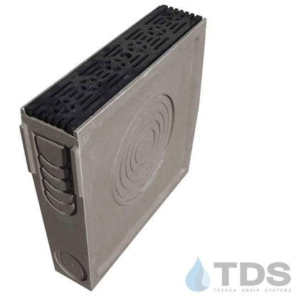 The catch basin accepts the same grate options, edging, and frames as the POLYCAST® 600 trench drains for an unnoticeable transition between the channels and catch basin. Cut-outs for side, bottom, and end outlets are located on the catch basin for easy installation. A core drill is available before shipment (at an additional cost).