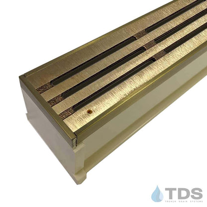 The TDS MAX Mini™ is an enhanced 3" NDS® Mini Channel system that features custom edging and TDS-exclusive Bronze Age™ grates in brushed or natural finish. Grates are made in the USA and are excellent for light-duty applications including residential pools, patios, spas, and tennis courts. Load Class A rating or B if properly installed, see specification sheets for details.