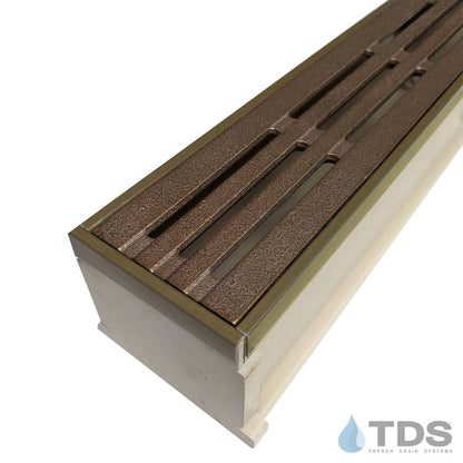 The TDS MAX Mini™ is an enhanced 3" NDS® Mini Channel system that features custom edging and TDS-exclusive Bronze Age™ grates in brushed or natural finish. Grates are made in the USA and are excellent for light-duty applications including residential pools, patios, spas, and tennis courts. Load Class A rating or B if properly installed, see specification sheets for details.