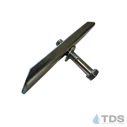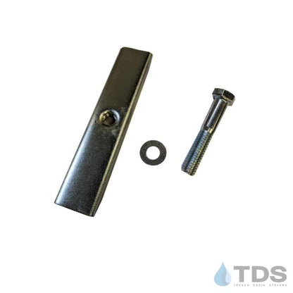 Hold-down device for fastening down your cast and ductile iron grate. For the POLYCAST® 600 Series trench drain system by Hubbell. Part# DA0642B.