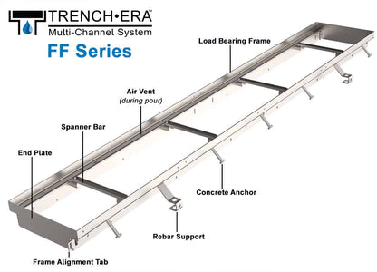 Designed for its versatility, the Trench•Era™ FF series drain system can accommodate a variety of high-capacity trench drain applications. This robust 'fast frame' and grate system is intended for channel drains that need to be fabricated on-site. This system provides a standard hardware pack with the exception of the supporting spanner bar, which varies in size depending on the width of the system. Frame lengths are available in 4', 6', and 8' sections and are determined by the length of the system selected.