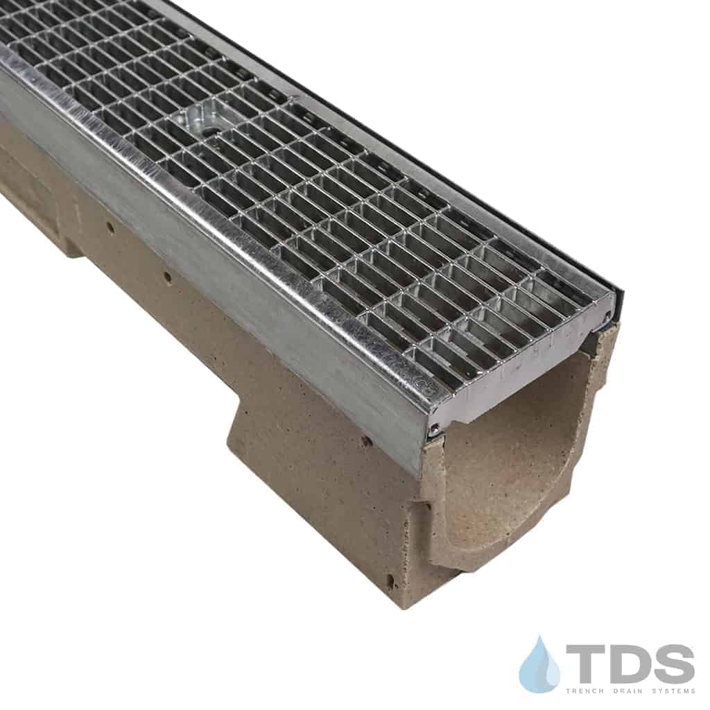 ULMA has a wide variety of drain gratings for its 100mm (3.94″) wide channels. This kit includes a Galvanized Steel Heel-Proof Mesh Grate. This grate is 124mm (4.89″) wide and 998mm (39.29″) in length. Load Class B.