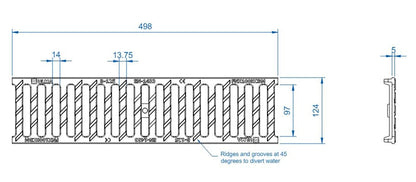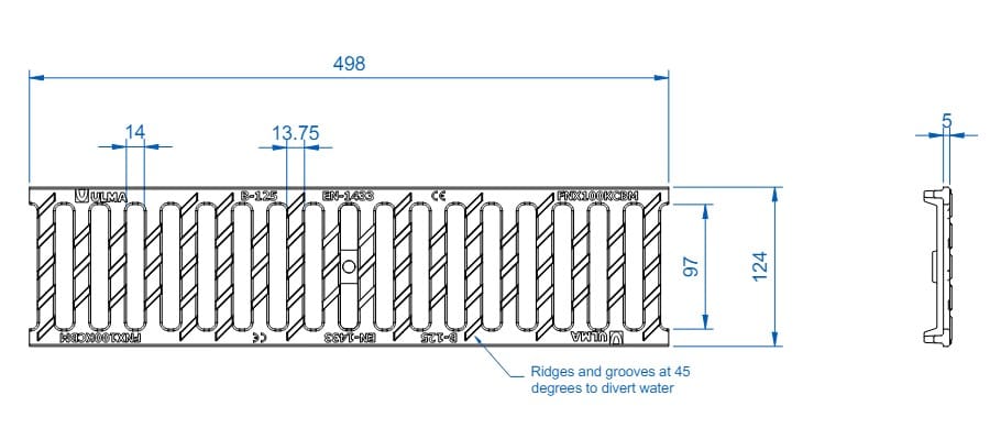 The ULMA D100 is a neutral polymer concrete linear trench drain channel with stepped edges for lateral protection. The polymer concrete material allows the channels to have higher impact resistance. It also provides a smooth channel surface with a near zero absorption rate which increases the flow rate, versus standard concrete which has a 5-10% absorption rate. The ULMA D100 channels are resistant to 59 different chemicals. (Not rated for sanitary or high-temp applications.)