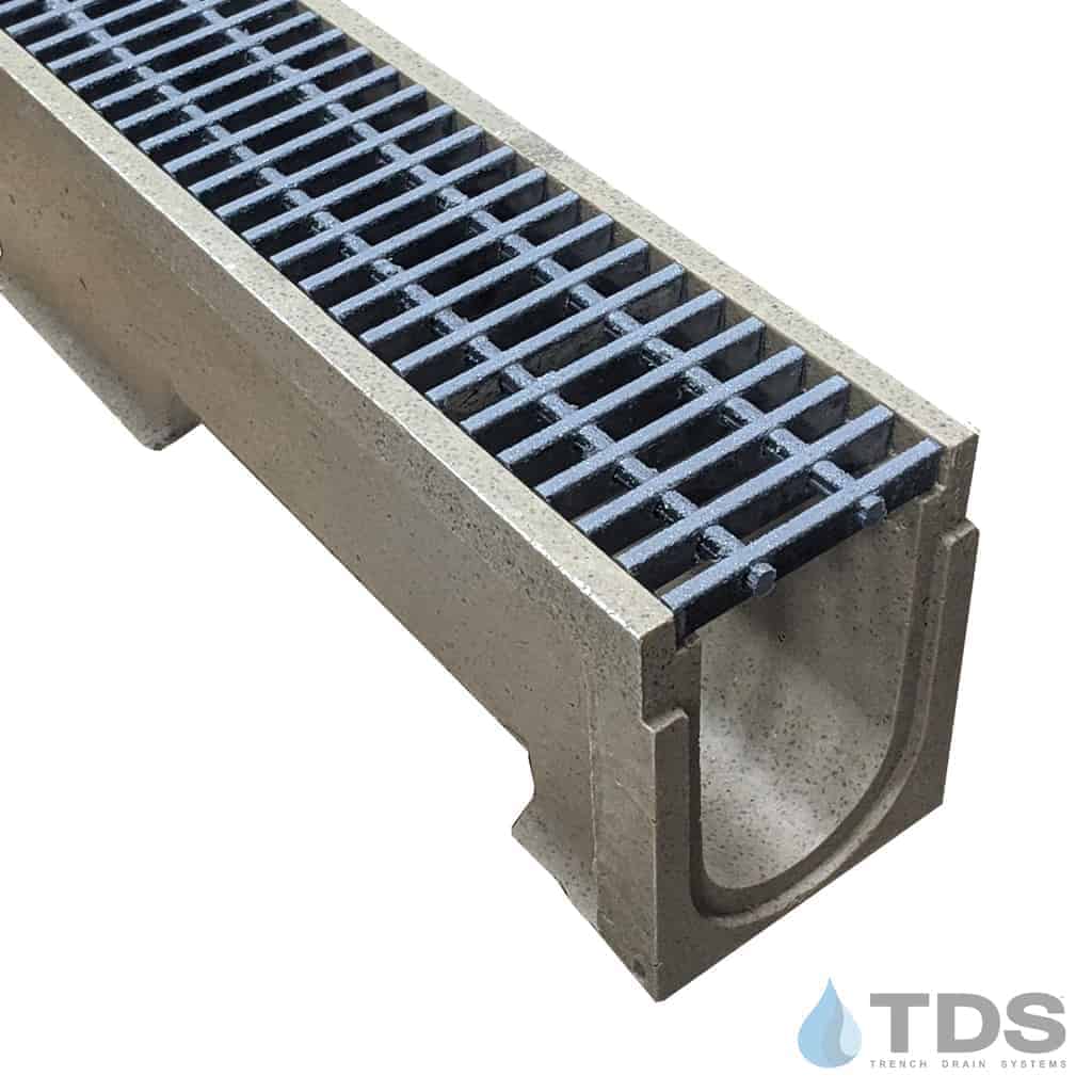 The ULMA D100 is a neutral polymer concrete linear trench drain channel with stepped edges for lateral protection. The polymer concrete material allows the channels to have higher impact resistance. It also provides a smooth channel surface with a near zero absorption rate which increases the flow rate, versus standard concrete which has a 5-10% absorption rate. The ULMA D100 channels are resistant to 59 different chemicals. (Not rated for sanitary or high-temp applications.)