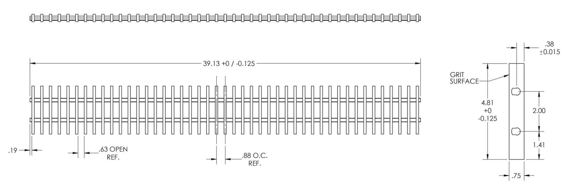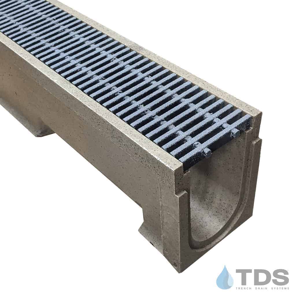 The ULMA D100 is a neutral polymer concrete linear trench drain channel with stepped edges for lateral protection. The polymer concrete material allows the channels to have higher impact resistance. It also provides a smooth channel surface with a near zero absorption rate which increases the flow rate, versus standard concrete which has a 5-10% absorption rate. The ULMA D100 channels are resistant to 59 different chemicals. (Not rated for sanitary or high-temp applications.)
