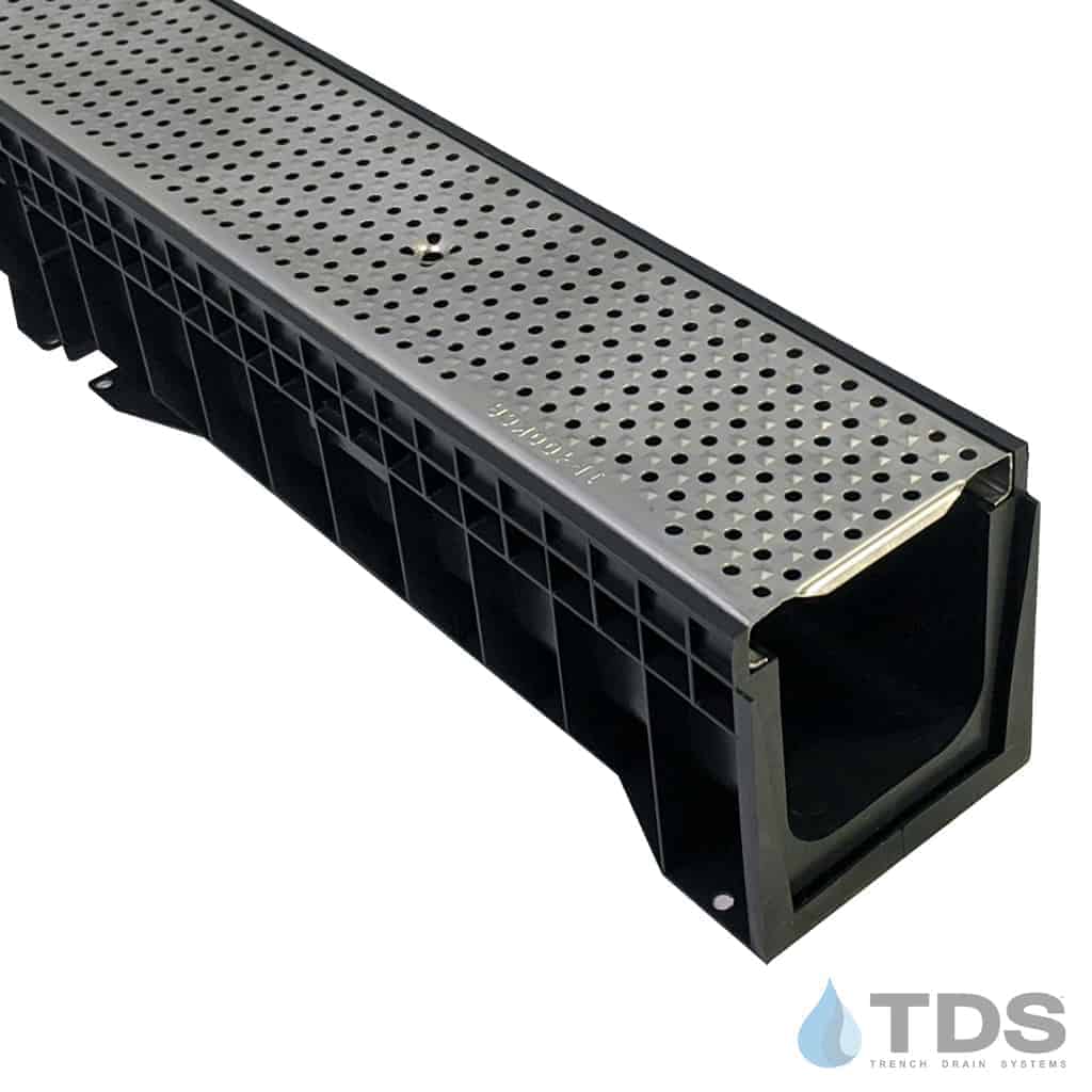 New from ULMA, the HYDROPLUS is a polypropylene trench drain for pedestrian and occasional car traffic for areas of low hydraulic requirements. Channel external width is 138mm, internal width 100mm and overall height 148mm. 1 meter in length. The HYDROPLUS is compatible with the same full line of grates as offered for the ULMA polymer concrete channels, offering a wide variety of options. The HYDROPLUS with the Stainless Steel Perforated (440) Grate is rated as a Load Class A, and measures 122mm X 1M. (1 grate per 1M channel section.) Channels are marked to aid in cutting to 0.5M length if needed.