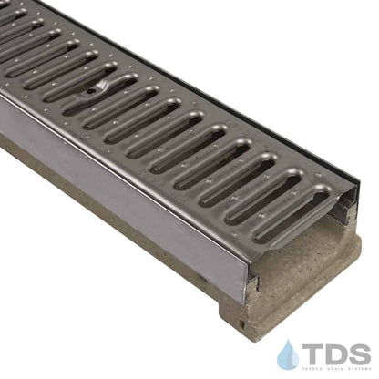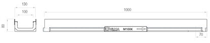 This shallow polymer concrete trench drain kit uses the ULMA Type M100KX channel with integral stainless steel edging. Similar to the H100KS, It has an external width of 130mm (5.12″), an internal width of 100mm (3.94″) and is supplied with an overall height of 80mm (3.15″). Channels are 1 meter in length and have a neutral slope. The locking system consists of locking bar CS100 and hex head screws. Installation hardware and solid end caps are included. Outlets are through the bottom of the channel. Each channel has one 4″ diameter knock-out (Drill-out).