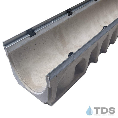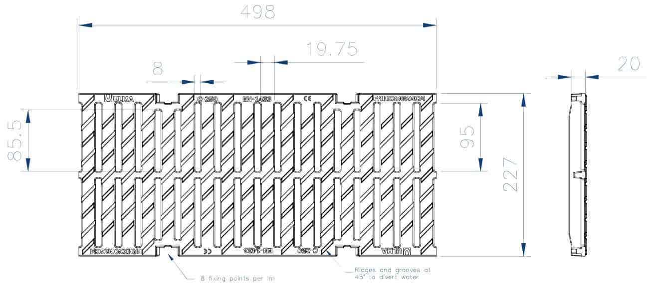 Each 1-meter channel provides a .5% slope. An external width of 9.29" (236mm), internal width of 7.87" (200mm) and variable heights make this drain channel suitable for a variety of applications including parking lots, commercial, or pedestrian traffic areas.658 ULMA FNHX200RGCM Dwg