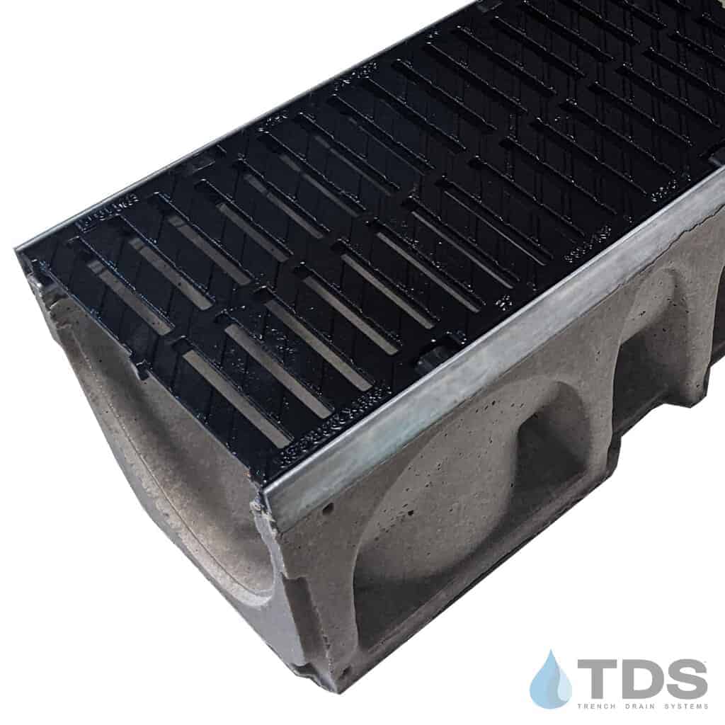 ULMA MultiV+200 linear drainage system with stainless edging and 658 slotted heel-proof ductile iron grate is an ideal water management system for light commercial traffic. This trench drain system is made with a self-cleaning V-shaped polymer concrete base designed to move water and debris away quickly.