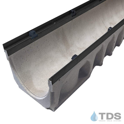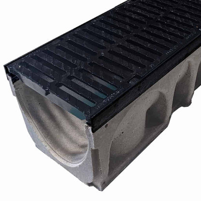 Each 1-meter channel provides a .5% slope. An external width of 9.29" (236mm), internal width of 7.87" (200mm), and variable heights make this drain channel suitable for a variety of applications including parking lots, and commercial, or pedestrian traffic areas.