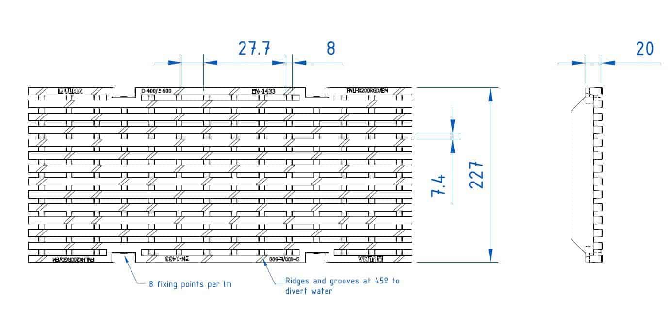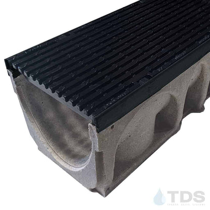 Each 1-meter channel provides a .5% slope. An external width of 9.29" (236mm), internal width of 7.87" (200mm), and variable heights make this drain channel suitable for a variety of applications including parking lots, and commercial, or pedestrian traffic areas.